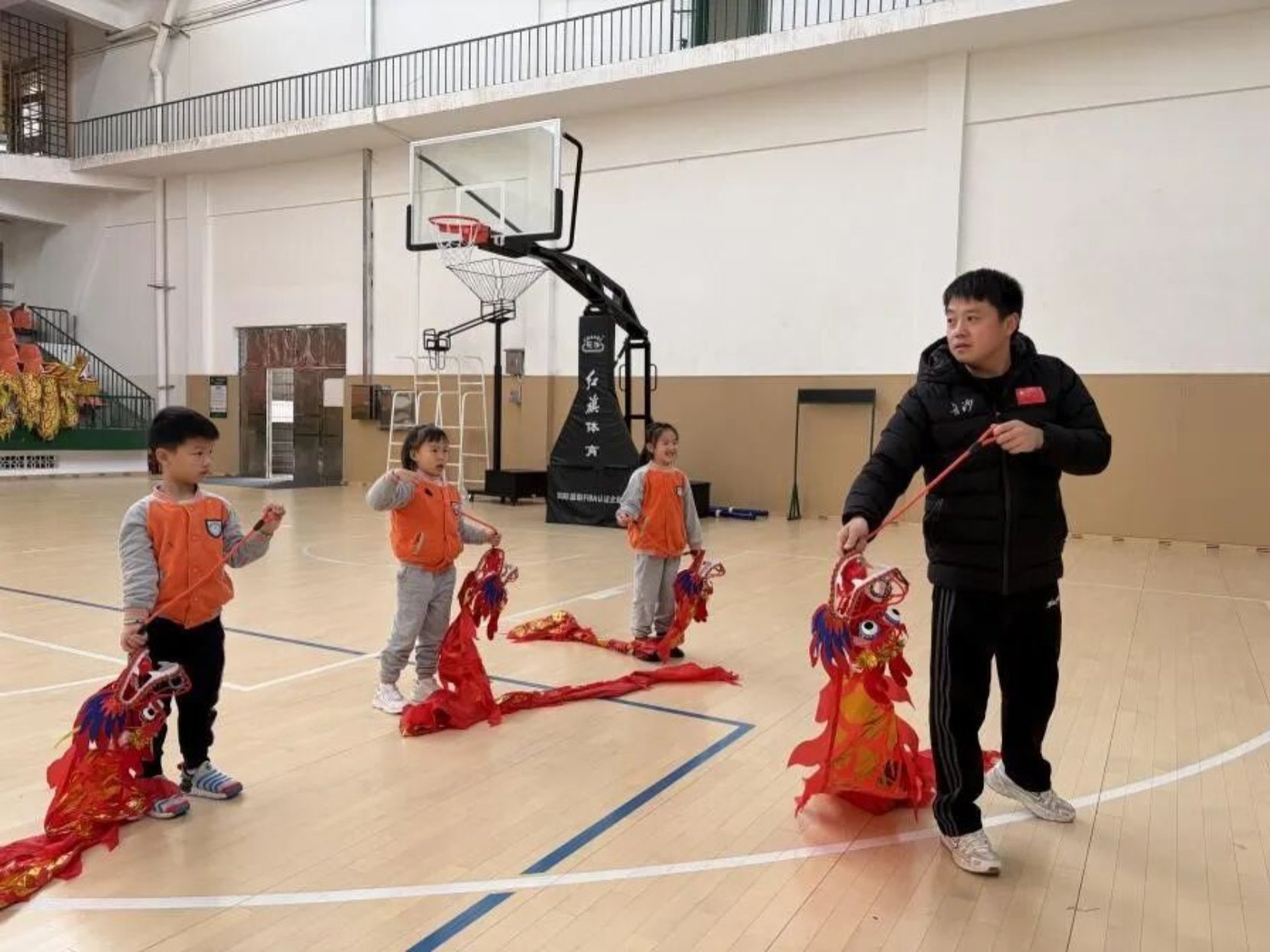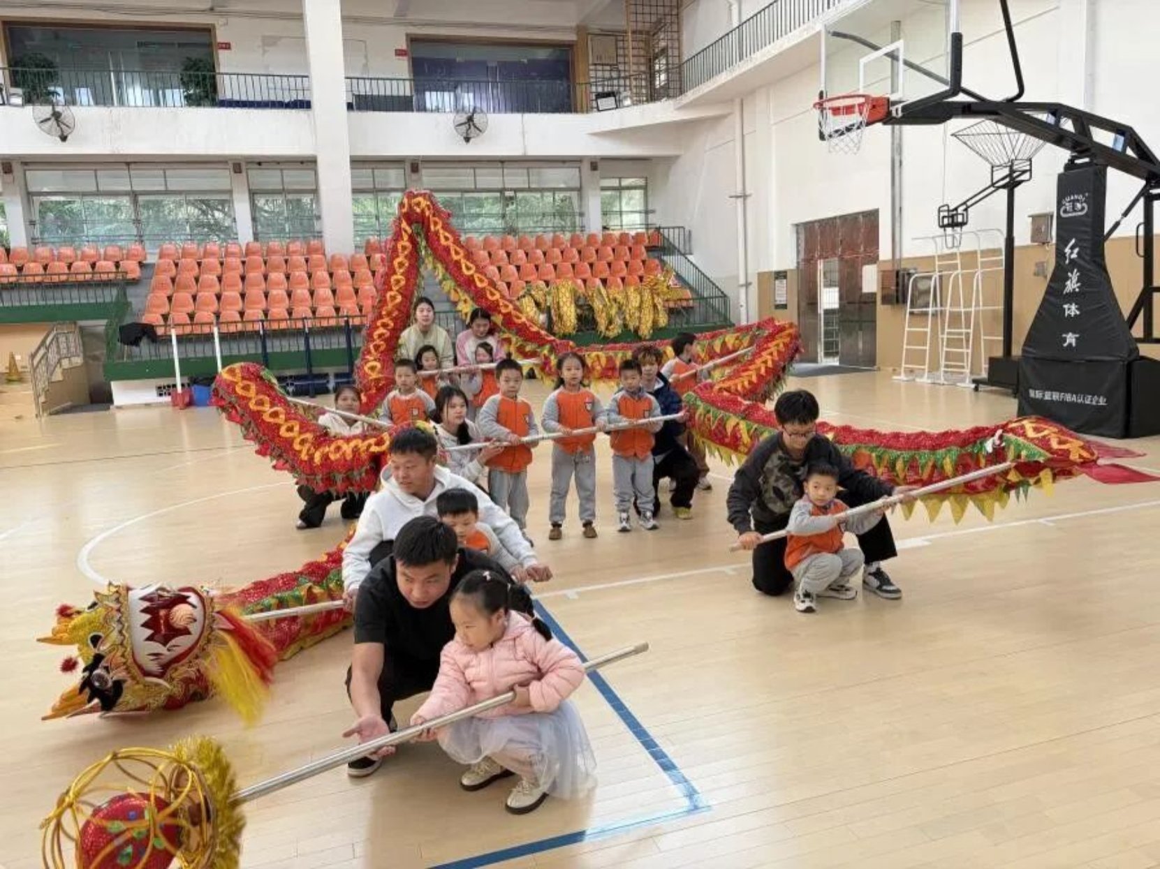最热闹的集体舞龙环节,成为课堂传承的高潮。23 级学子们协助萌娃们共同托起长长的龙身,有的执掌龙头引领方向,有的帮扶龙身保持平衡,有的指导尾部呼应节奏。在李老师的统一指令下,“大手”护“小手”,“小龙”随“大龙”,整条彩色长龙不仅稳稳绕圈游走,更成功完成了五角星造型的挑战。这场跨越年龄的协作,既是体育教育中团队精神的培养,更是非遗传承中“众人同心”文化内涵的生动诠释。