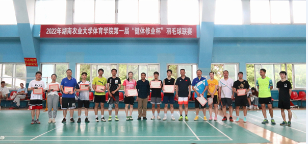 (供稿:廖胜文)为贯彻落实学校体育大会精神,提升师生健康水平,展示新时代湘农人蓬勃朝气和竞技热情,助力师生在体育锻炼中“享受乐趣,增强体质,健全人格,锤炼意志”,4月23日至24日,体育学院第一届“健体修业杯”羽毛球赛在校羽毛球馆举行。学院院长曹庆荣、副院长熊少波来到比赛现场为参赛选手加油助威,学院党委副书记、工会主席彭成根亲自参加比赛。