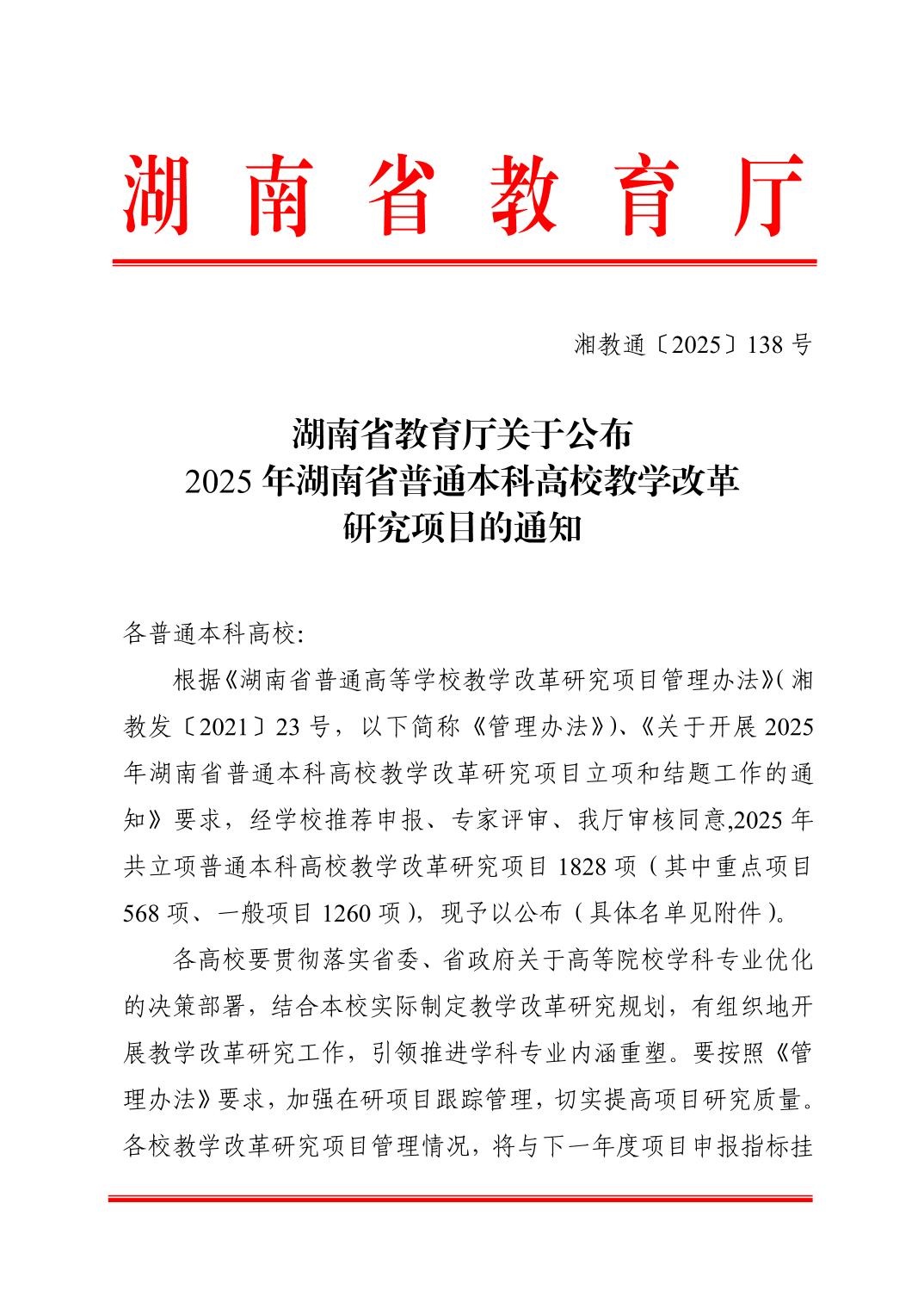 2025年湖南省普通本科高校教学改革研究项目的通知以及公示