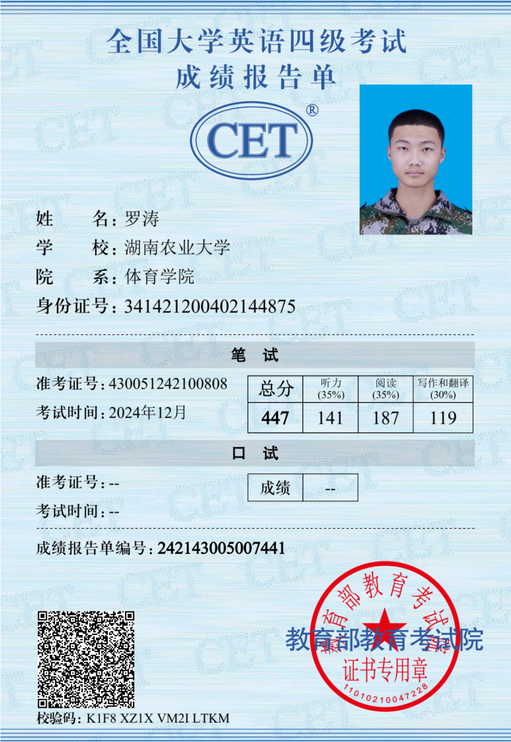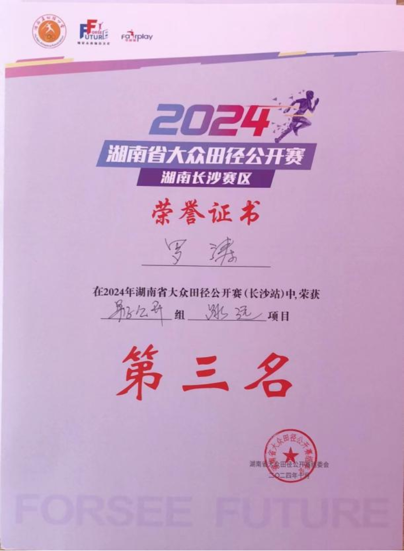 罗涛同学在大学期间担任着班长以及学院学生会干部,做事情始终尽职尽责有着高要求。他成绩优异因此曾获得国家励志奖学金、校级一等优秀学生奖学金、三好学生以及优秀团员等荣誉。在2025年6月他参加了湖南省体育教育专业基本功大赛,并且取得团体总分三等奖、个人基础理论知识与教学技能第二名以及团体一等奖的好成绩,体现了良好的学习能力和专业素养。高中阶段他学习日语,大学期间通过自学英语并通过了英语四级考试和计算机二级等级考试。