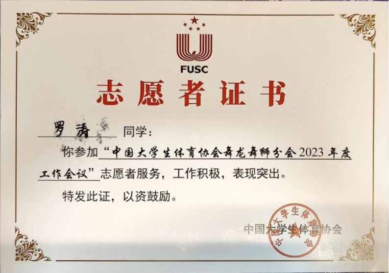 罗涛同学积极将所学服务于社会,他的身影活跃于多项大型活动的志愿者行列中,如中国大学生舞龙舞狮工作会议、湖南省青少年大学生足球联赛、湖南农业大学120周年校庆等,并因其出色表现荣获“优秀志愿者”称号。