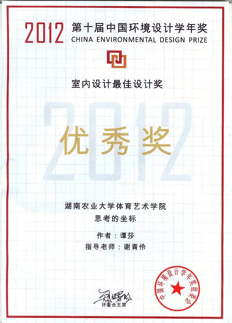 湖南农业大学体育艺术学院08级艺术设计1班学生谭莎同学室内设计作品“思考的坐标”获得"2012第十届中国环境设计学年奖"室内设计优秀奖。