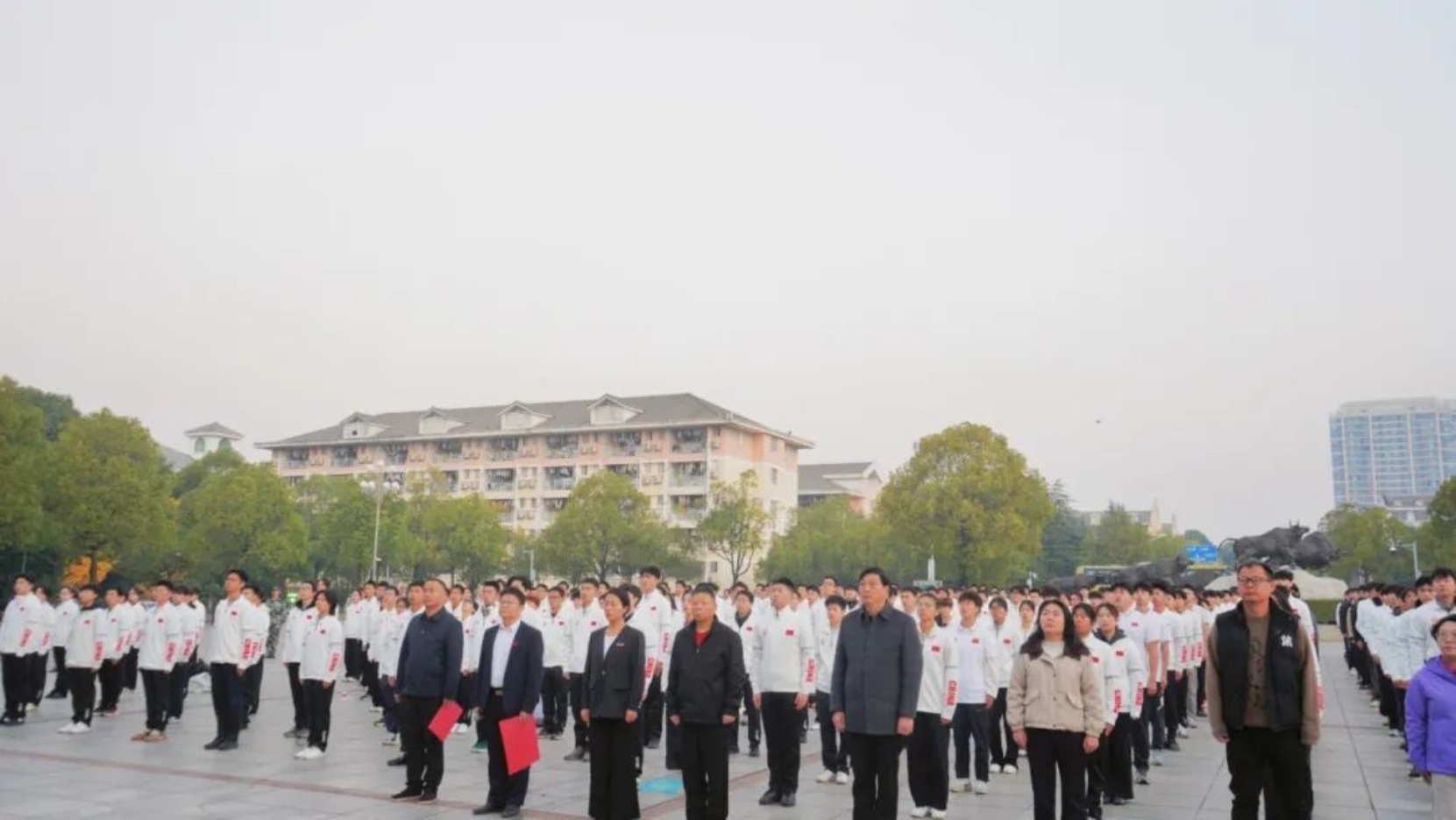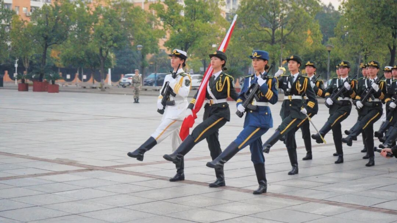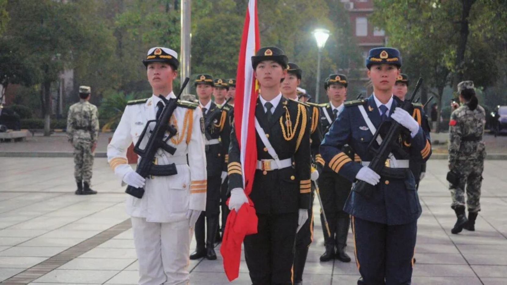 仪式伊始,国旗护卫队身着军装,铿锵迈步升旗台。国歌奏响,五星红旗冉冉升起;校歌悠扬,校旗同步高扬,全体师生肃立致敬、高声歌唱,以挺拔身姿践行“健体修业,超越自我”的院训精神。