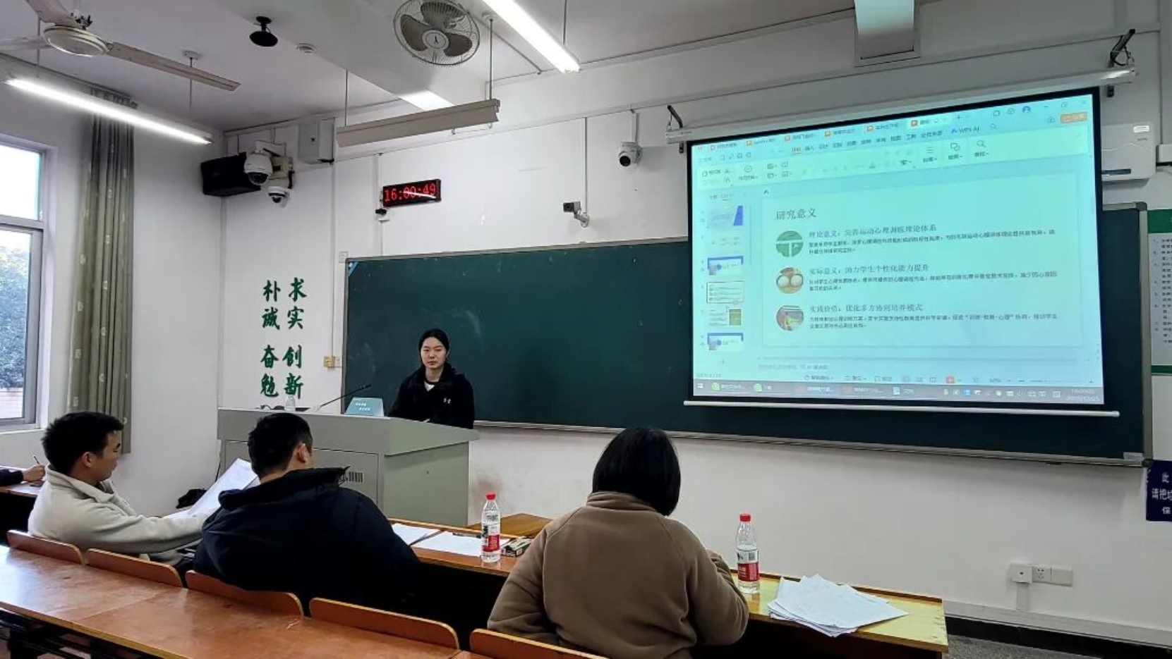 论证会以分组形式进行,每组由3位专业教师担任评审。会上,毕业生通过PPT展示,分别就研究背景与意义、研究方法与内容、创新点等关键方面进行了汇报。选题覆盖校园体育教学模式创新、地方体育赛事发展、智能体育设备应用等多个方向,既贴合体育教育学实际,又关注行业前沿动态,体现了学生对社会需求与学科热点的积极思考。