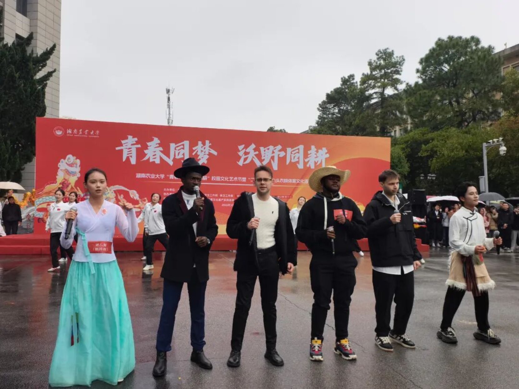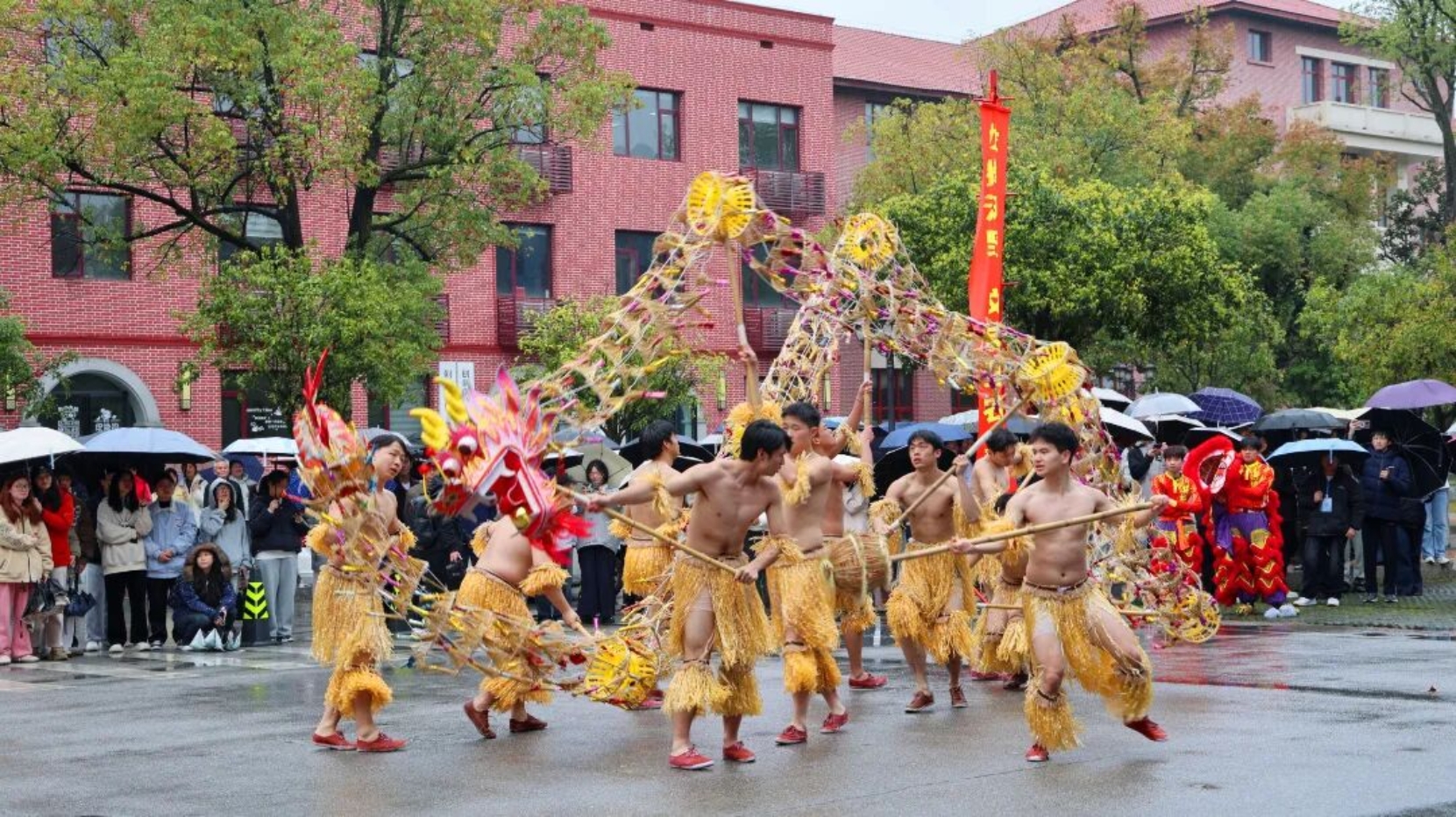 学校舞龙队带来稻草龙表演《草龙朝聖》,龙身随龙珠腾挪翻转,展现出农耕民俗的独特魅力;少数民族学生与留学生代表共同演绎歌舞《龙的传人》,汇聚多民族风采与中外文化交流之美,将民族风情与家国情怀融为一体,全体表演者雨中倾情演出、精神昂扬,以赤诚之心诠释中华优秀传统文化的包容性与凝聚力,赢得现场阵阵掌声。