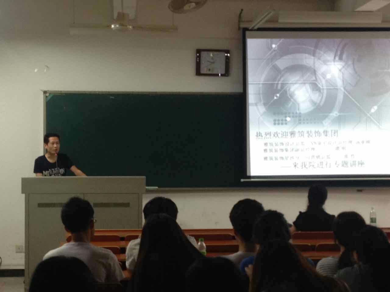 7月3日,体育艺术学院在十教南137举行2014级大学生就业指导讲座,本次讲座邀请了湖南雅筑装饰设计总监、V8豪宅设计总经理汤亚刚,参与活动的人员是体艺院艺术设计专业的全体同学。