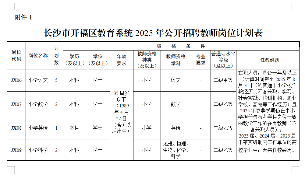 附件1:长沙市开福区教育系统2025年公开招聘教师岗位计划表.docx
