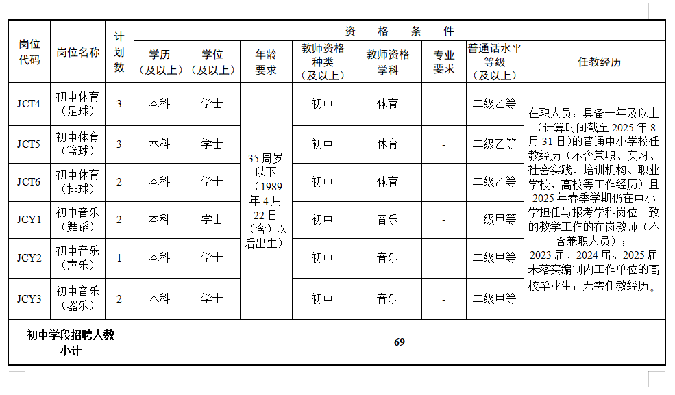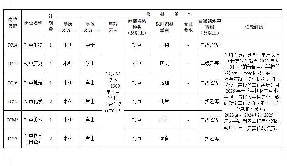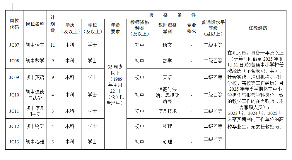 ②2023届、2024届、2025届未落实编制内工作单位的高校毕业生:无需任教经历(其中2025届高校应届毕业生可暂凭加盖毕业院校就业部门印章的毕业生就业推荐表及岗位要求的其他相关材料报名、参加资格审查,但需在2025年7月31日前提供相应学历学位及其他报名资格证书原件,否则取消聘用资格)。