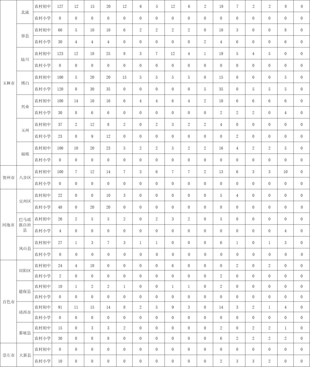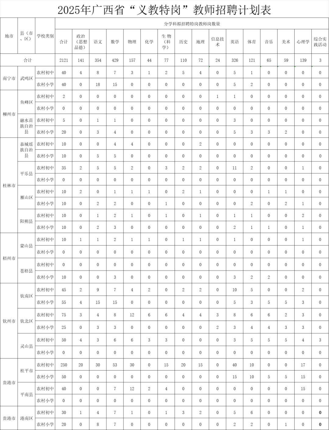 面向全区31个县(市、区)设岗,计划招聘农村义务教育阶段学校特岗教师2121名。各设岗县(市、区)分学科岗位招聘计划详见附件。