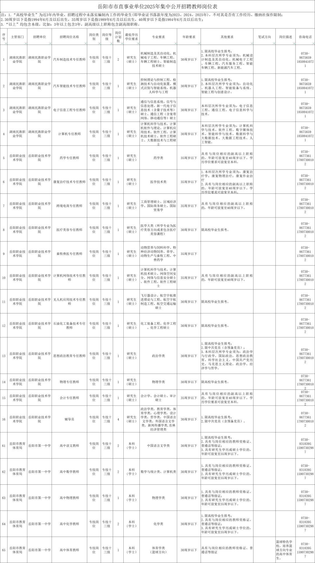 根据《关于进一步做好事业单位公开招聘工作的通知》(人社部发〔2024〕57号)、《湖南省事业单位公开招聘人员办法》(湘人社规〔2025〕1号)等相关文件精神,结合工作需要,面向社会公开招聘市直事业单位工作人员(使用事业编制)。本次公开招聘公告及附件在岳阳市人力资源和社会保障局官网(http://rsj.yueyang.gov.cn)发布。