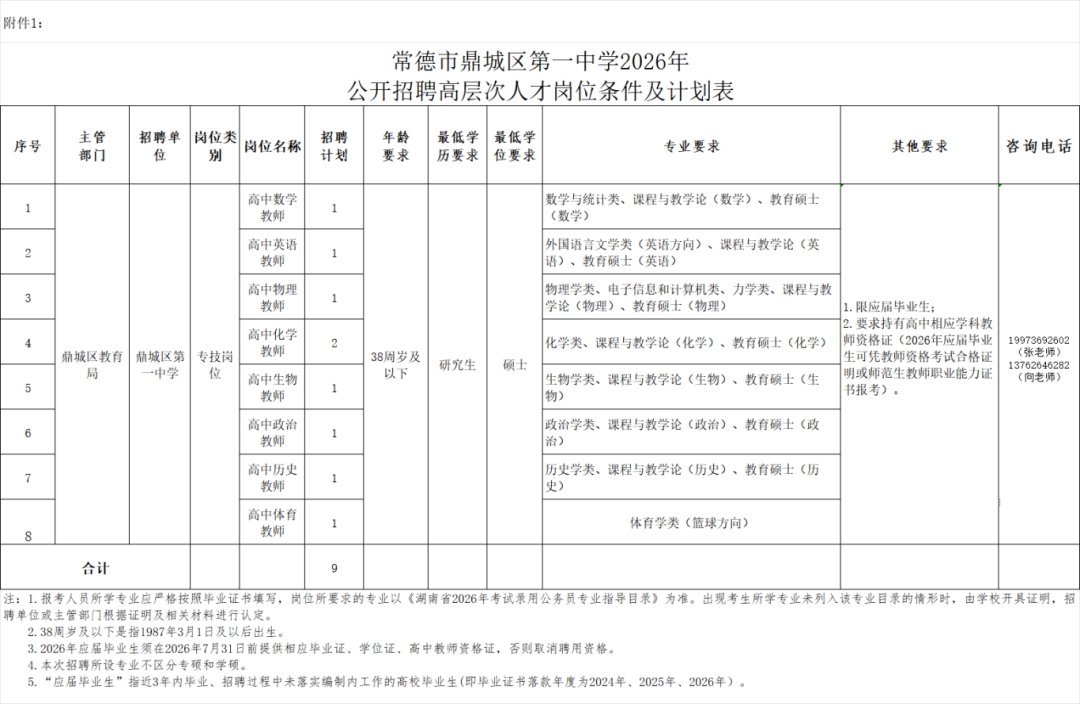 附件1:《常德市鼎城区第一中学2026年公开招聘高层次人才岗位条件及数量表》