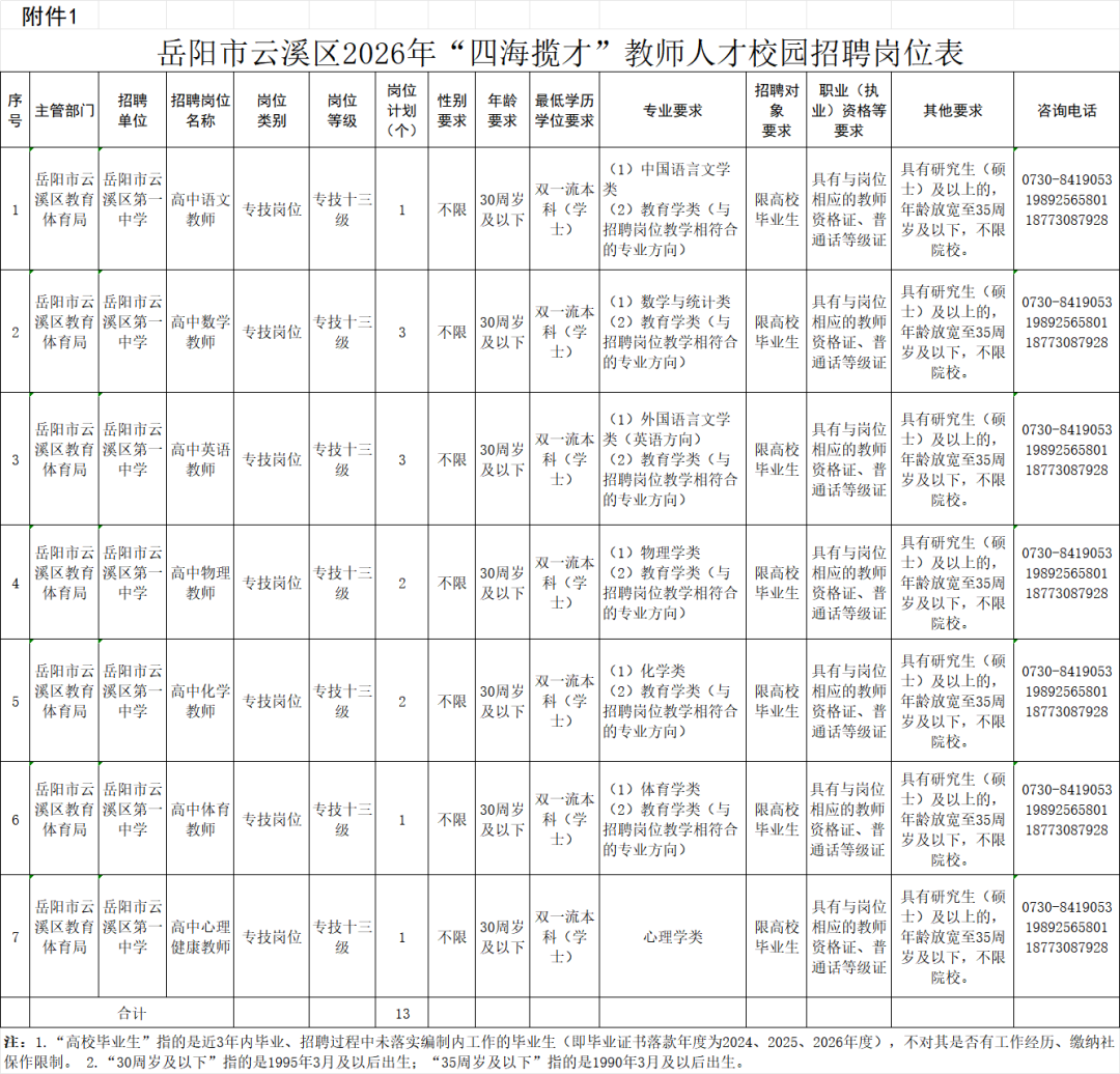 1.岳阳市云溪区2026年“四海揽才”教师人才校园招聘岗位表