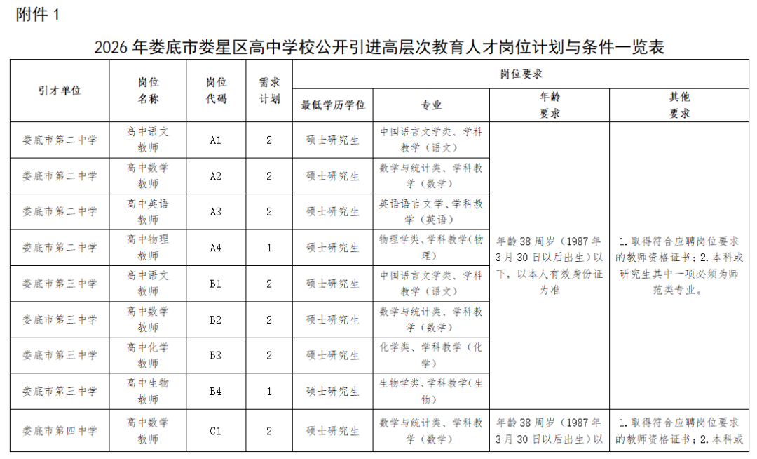 附件1:2026年娄底市娄星区高中学校公开引进高层次教育人才岗位计划与条件一览表